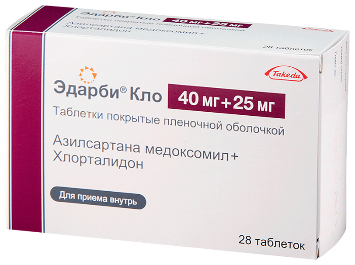 Комбинированный антигипертензивный препарат. В состав препарата Эдарби® Кло входят антагонист рецепторов ангиотензина II (азилсартана медоксомил) и тиазидоподобный диуретик (хлорталидон). Одновременное применение двух действующих веществ приводит к более выраженному снижению АД по сравнению с приемом каждого из них в монотерапии. При приеме препарата 1 раз/сут достигается эффективное снижение АД в течение 24 ч.